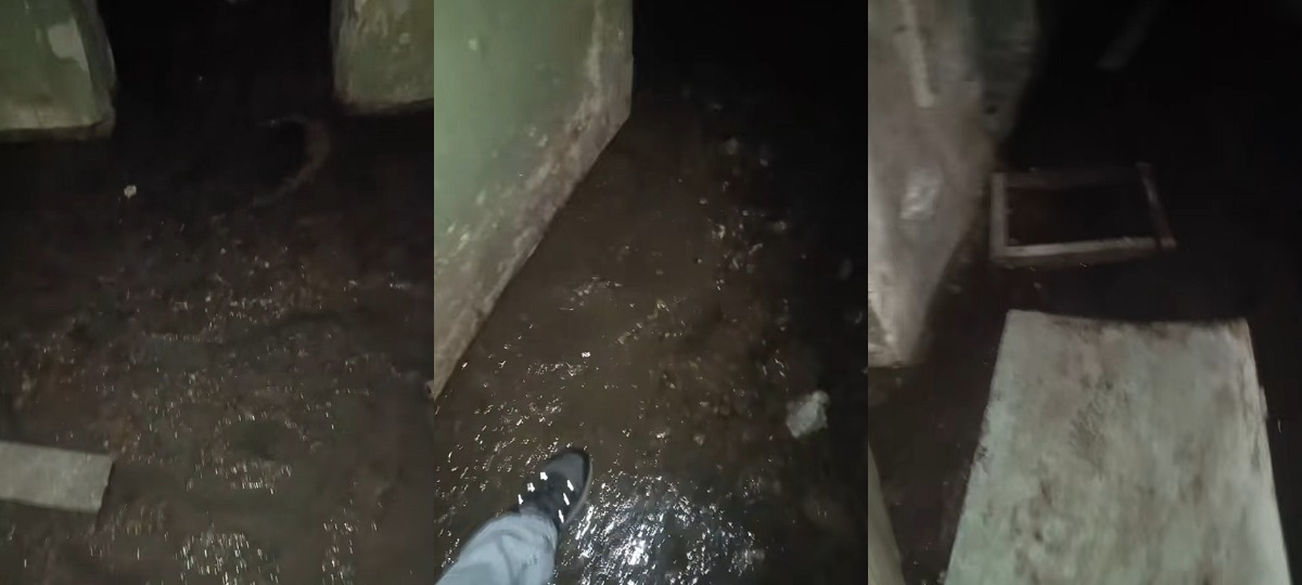 На відэа бачна, што падвальнае памяшканне запоўнена цёмнай бруднай вадой. Падлога фактычна пакрытая слоем каналізацыйных адходаў, а па праходзе паміж сценамі даводзіцца літаральна ісці па лужынах. У некаторых месцах вада працягвае цячы, утвараючы новыя патокі. Аўтар роліка таксама адзначае, што ў падвале стаіць моцны непрыемны пах.