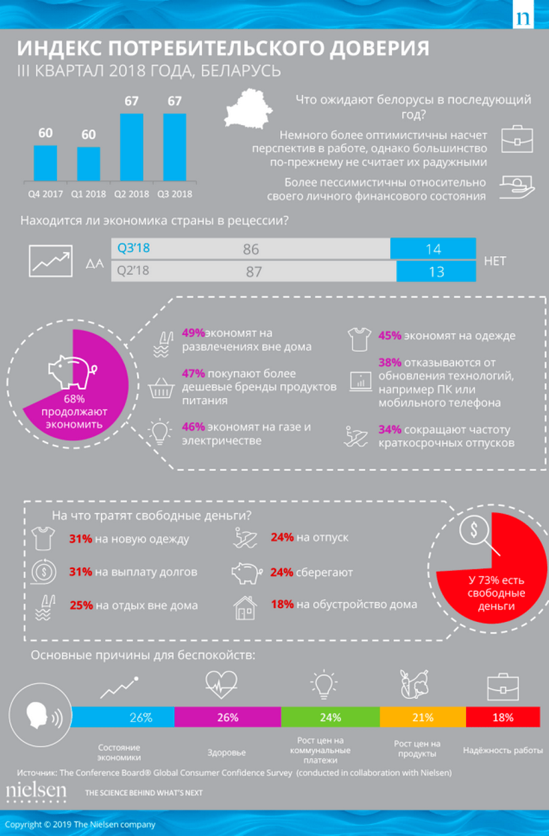 Компания Nielsen представила данные исследования глобального потребительского доверия (Global Consumer Confidence Survey) за третий квартал 2018 года. Беларусь была включена в список стран, где проводится исследование по измерению настроения потребителей в 2016 году, сообщает ej.by, ссылаясь на belretail.by.