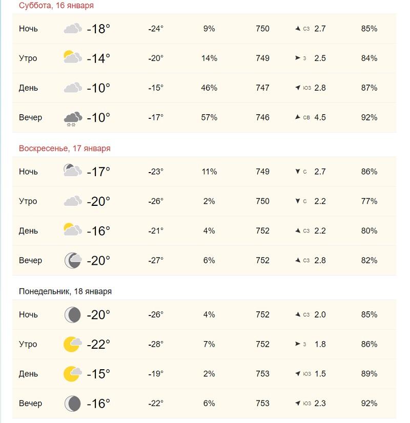 Примерно такая же погода будет в Гродно. Там в ближайшие дни температура не упадет днем даже до -20. В пятницу – -16, в субботу – -17, в воскресенье – -18. Холоднее всего будет в ночь с воскресенья на понедельник – до -27.