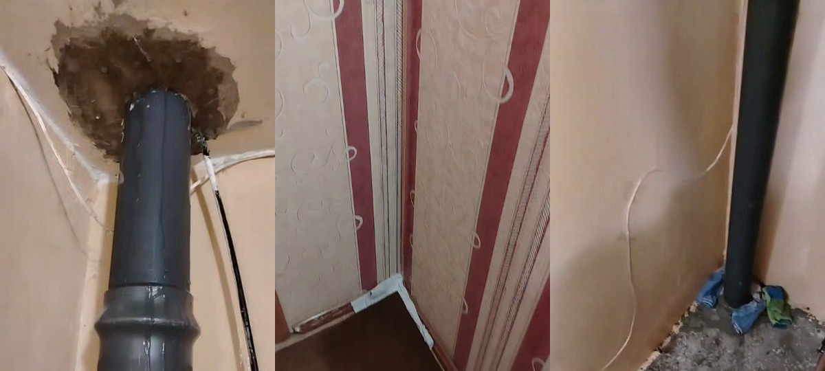 На опубликованных кадрах видно, что вода стекает по трубам и стенам прямо в подъезде. В местах протечек образовались темные влажные пятна, штукатурка повреждена, а в отдельных зонах заметны следы плесени. В углах подъезда — сырость, отслаиваются обои, а полы и стены регулярно намокают. Судя по видео, проблема затрагивает не только общие помещения, но и квартиры.