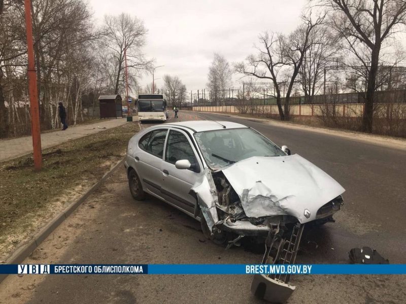 Авария случилась сегодня около 9 утра. За рулем легкового «Рено» был 18-летний брестчанин, не имевший водительских прав. Он ехал по улице Мошенского и при обгоне рейсового автобуса «МАЗ» в районе остановочного пункта напротив дома №110 не рассчитал свой маневр, врезавшись в переднюю часть автобуса под углом. Об этом сообщает ГАИ УВД Брестского облисполкома.
