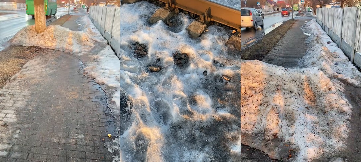 «А вось зноў, глядзіце. Мар’іна Горка. Гэта ж краіна цудаў ці краіна дурняў. Ідзе тратуар і кіпа снегу, б***ь… Ну як так можна? Што гэта такое? Людзі пратапталі сцежку і абыходзяць усё», — кажа мужчына ў роліку, дэманструючы, як пешаходам даводзіцца абыходзіць гурбы і слізкія ўчасткі.