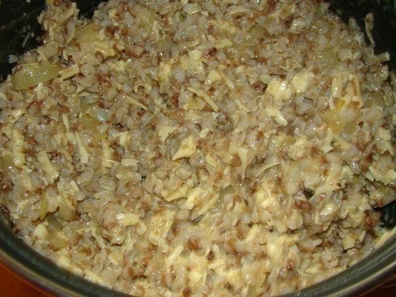 Готовим: Лук спассеруйтете на сливочном масле. Сыр натрите на крупной терке. Смешайте вареную гречку, лук и сыр. Вбейте яйца, посолите и поперчите.