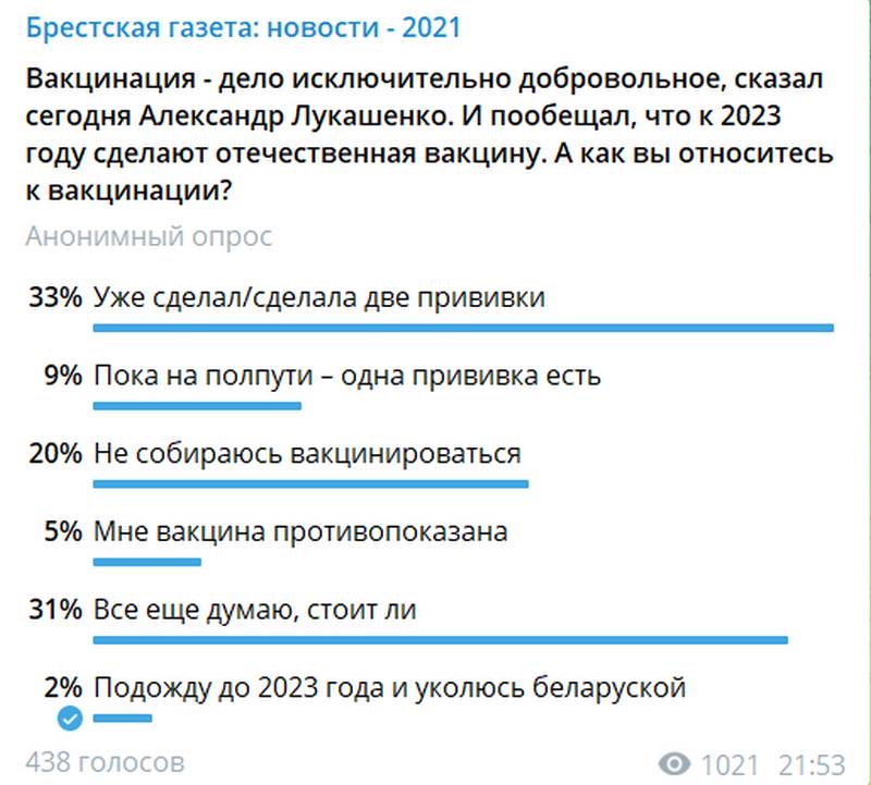 Результаты второго опроса оказались не столь однозначными. На этот раз мы поинтересовались у читателей, как они относятся к прививкам. Среди 438 проголосовавших, привились только 33%. Еще 9% – прошли половину пути к вакцинированию. 31% – до сих пор еще думают, а 20% – и вовсе не собираются вакцинироваться.